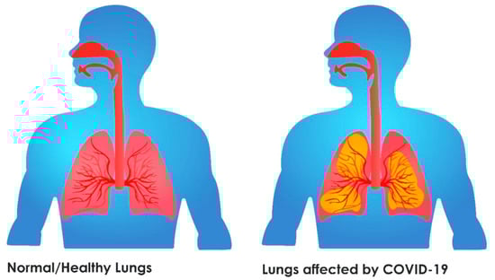 COVID-19 was first reported by the Wuhan Municipal Health Commission, China, in December 2019. It is caused by the severe acute respiratory syndrome coronavirus 2 (SARS-CoV-2), and is considered one of the deadliest global pandemics in history []. The World Health Organization (WHO) declared the COVID-19 outbreak a pandemic in March 2020, and there have been 203,944,144 cases and 4,312,902 deaths globally according to the WHO statistics of 12 August 2021 (available online: https://covid19.who.int/table (accessed on 12 August 2021)). The pandemic situation has caused worldwide distress by affecting people socially, medically, and economically. This infectious disease in severe form often leads to acute respiratory syndrome and the development of pneumonia. The outbreak was thought to be initiated via zoonotic spread from the seafood markets in Wuhan, China. Later, it was believed that transmission between humans was responsible for community spread of the infection throughout the world, and approximately 200 countries have been affected by this pandemic [,,,]. Although individuals of all ages are at risk of being infected, severe COVID-19 symptoms are more likely in people aged 60 and above, and individuals with comorbidities.