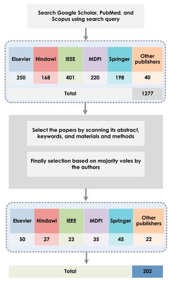 The relevance of a paper was based on title, abstract, materials and methods. An article was considered based on the voting scheme by the authors’ group of the current study. The authors are well-versed in the field of deep learning and machine learning techniques using various imaging modalities. Low-quality and conference papers were removed from the database. A final total of 202 papers (184 articles with 18 review papers) were compiled and analyzed. The selection process is shown in Figure 2. To the best of our knowledge, we have considered the data mining and deep learning research publications reported to present for identification of COVID-19 using various image modalities.