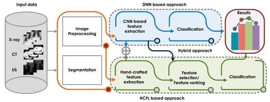 Based on the state-of-the-art AI techniques to automatically detect COVID-19 using medical imagery, we categorized the methodologies as: (i) the DNN-based approach, (ii) the HCFL-based approach, and (iii) the hybrid approach. The input data consisted mainly of X-ray, CT, and US medical images of patients. In the DNN-based approach, convolutional neural networks (CNNs) are employed to automatically characterize the COVID-19 imagery. The DNN approach groups the feature extraction and classification components into an integrated neural network. In the HCFL-based approach, knowledge of features extraction techniques is required, followed by feature selection/ranking and classification stages. The hybrid approach fuses the methodologies from DNN- and HCFL-based approaches to obtain promising results. Figure 3 illustrates the key components used in the COVID-19 detection system.
