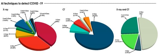 In all performance measures, the higher the value, the better the performance of the model. The developed AI models for COVID-19 detection using various medical images, such as X-ray, CT, and US, can be categorized into 2, 3, 4, and 5 classes per imaging modality, as shown in Figure 5.