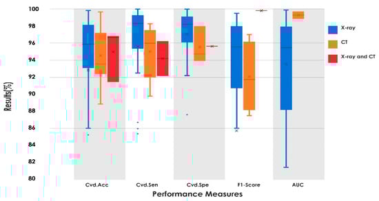 It is observed from Table 6 that the systems developed with X-ray and CT images had five-class classification and achieved a Cvd.Acc (avg.) of 92.41% using X-ray images. It is also observed that the two-class models are no longer valid when other diseases with similar symptoms were presented []. It is noted from Table 2, Table 3, Table 4 and Table 5 that few studies have performed four-class (normal vs. COVID-19 vs. viral pneumonia (VP) vs. bacterial pneumonia (BP)) classification [,,,,,,,,]. They have obtained the Cvd.Acc (avg.) of 89.91%. Hence, for further analysis of the system we considered the model which can categorize three or more images. Box plot analysis was carried out to obtain the overall performance of the three-class classification system used in COVID-19 detection. Figure 6 shows the box plots for Cvd.Acc, Cvd.Sen, Cvd.Spe, F1-Score, and AUC values of the reported AI methods in the three-class classification scenario. Box plots represent the distribution characteristics of performance measures based on minimum, first quartile, median, third quartile, and maximum.
