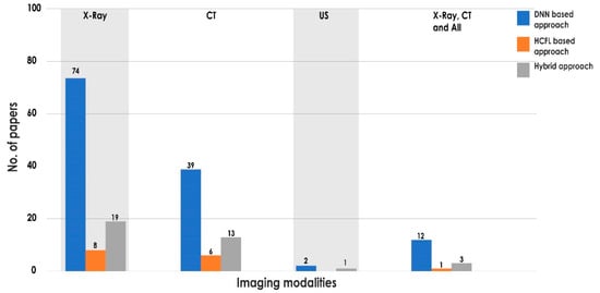 It is observed from Figure 7 that 70% of the papers reported the use of a DNN-based approach, which included pre-trained networks and customized CNNs. Very few papers were developed to quantify the severity of COVID-19 [,,,,]. It is also noted that the computational cost of various deep learning approaches is high [,]. From Figure 5, 40%, 78.26%, and 50% of the papers using X-ray, CT, and all modalities, respectively, reported only two-class classification. However, it is difficult to show its significance level in real-time to categorize multiple classes with similar symptoms. It is also observed from Table 6 that, for four-class classification, the Cvd.Sen and Cvd.Spe of the methods increased 4.5% and 1.66%, respectively, using CT images, when compared to X-ray images. In most of the cases, CNNs were able to successfully extract significant information from lung tissue with pneumonia, (i.e., BP and VP). Pre-trained networks such as ResNet, DenseNet, and VGG were successfully used in all of the modalities for greater than three-class categorization. However, the comparison of the pre-trained networks for binary classification may not be as useful, since it may fail to distinguish diseases which have similar symptoms with COVID-19.