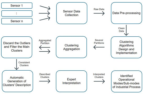 The proposed general methodology is a semi-automatic data-driven approach to detect and identify unknown operational modes from sensor data of an industrial process. The approach only requires human intervention for the final interpretation of the aggregated clusters. These clusters are obtained as the result of a consistency filtering process of the aggregated clusters obtained from an ensemble of clustering techniques.