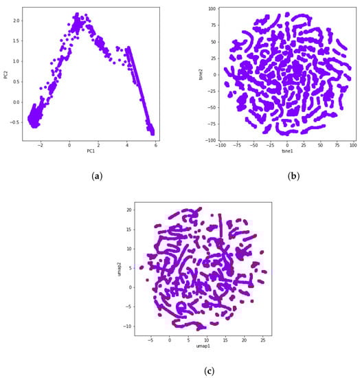The new cutting edge t-SNE technique is modeled as a stochastic neighbor embedding (SNE). It keeps both the local and global structures of the original data, and preserves well-separated clusters []. UMAP is one of today’s best dimensionality reduction methods and is very similar to t-SNE. Like t-SNE, UMAP also uses a graph layout algorithm. In this sense, the UMAP algorithm relies on algebraic topology and Riemannian geometry. Though both techniques provide a similar output, UMAP often arguably preserves the global structure better in the final projection, i.e., the inter-cluster distance is more meaningful with UMAP than with t-SNE []. The t-SNE and UMAP visualizations can be seen in Figure 3b and Figure 3c, respectively.