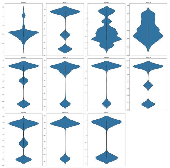 Due to the importance of detecting the transitory effects of operational modes in a gas turbine, the absolute minimum requirement is that datasets are of 1-min length. We selected this dataset so that we could capture a period of time with the maximum amount of output power fluctuation, which is the most important indicator for a gas turbine’s operation states. In Figure 4, the violin plot displays a summary of the statistical description of the data.