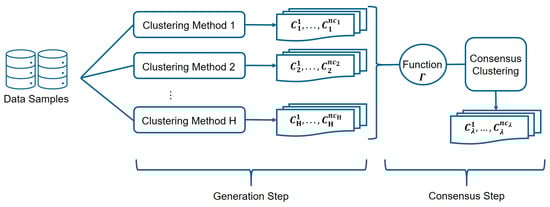 As it is impossible to know in advance which clustering algorithm will be appropriate for the problem at hand, in the generation step of the cluster ensemble framework, several data partitions are produced for aggregation in order to optimally provide a consensus partition in a robust and stable manner []. As shown in Figure 2, we start the ensemble clustering pipeline by designing and selecting some clustering algorithms. Next, clustering ensembles are produced. They can be generated by using several techniques: (i) employing different clustering algorithms, (ii) implementing the same clustering algorithm with several hyperparameters or initialization parameters, (iii) exploring different dissimilarity measures within a given clustering algorithm, (iv) using different sets of data objects, (v) selecting distinct subsets of data features, and (vi) projecting the original data space into a lower dimensional data space [,,,].