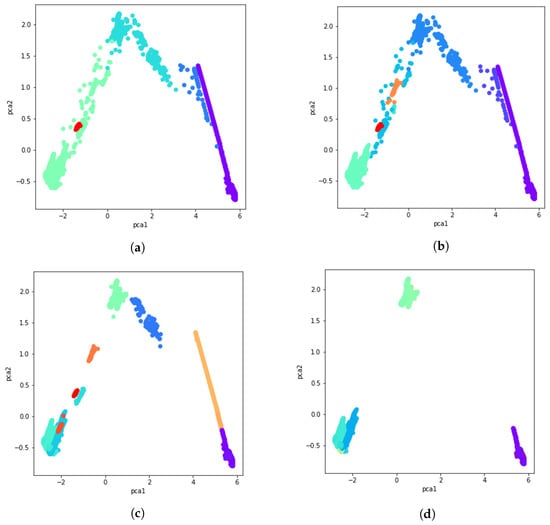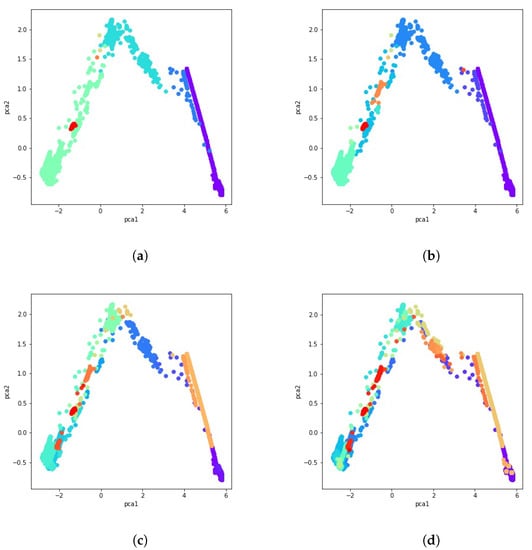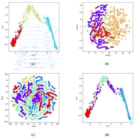 During PCA, data are rotated and mapped along the direction of increasing variance in order to find the subset of variables with the maximum variation that can be measured. These are the principal components []. Figure 3a shows the dimensionality reduction result of the selected dataset using two principal components.