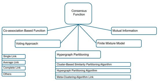 Among the methods for the consensus step, co-association based methods, hypergraph partitioning based methods, methods based on mutual information, methods using finite mixture models and voting based methods are the most common ones (see Figure 7). Using a co-association function, one tries to map partitions, which are observed in the cluster ensemble, into a matrix, whose values represent how many times these objects are found in the same cluster []. With graph-based methods, ensemble partitions are converted into a graph or hypergraph representation problem []. It consists of vertices and hyperedges, where vertices represent data points and hyperedges describe a set of objects belonging to the same clusters. Mutual information is carried out as a similarity measure between partitions, using mutual information maximization between labels of the partitions in the cluster ensemble, and labels of the consensus partition []. Using the expectation maximization (EM) algorithms, a finite mixture model approach maximizes a likelihood estimation problem. As a result, a solution to the maximum likelihood problem will give us a consensus partition []. Relabeling and voting methods are based on how many times each object belongs to a cluster. In this case, the consensus partition is reached through the voting process after labeling the clusters through the voting process [].