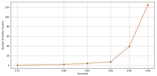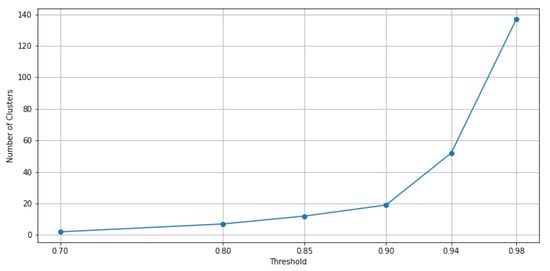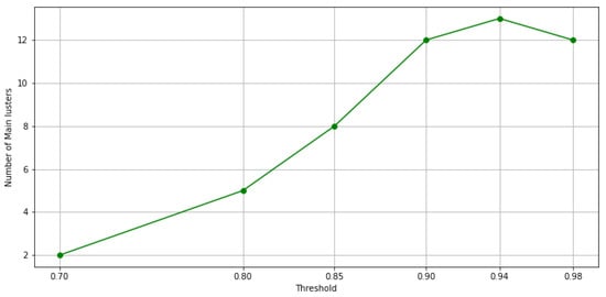 As a result, the co-occurrence of each event is equivalent to a vote in favor of their coming together as a cluster. By dividing this matrix by the number of clustering solutions H, a normalized voting result is obtained, given that each co-occurrence is a vote toward their gathering in a cluster. A majority vote is used to generate the underlying data partition in which normalized votes are compared with a specific threshold, and all data linked this way are grouped together in the same cluster. It can be said that this threshold represents a consistency threshold, a number in the range . By thresholding the co-association matrix, as previously described, it should be possible to recover a robust cluster structure and their consistent clusters. In this case, when the threshold is set, the cluster consistency, which is a percentage, is measured as 100 times the consistency threshold.
