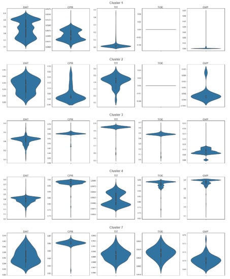 After the proposal of our methodology for discovering and defining these operational modes, in the future, we will develop a transition network model based upon these operational modes. The sequence of operational modes clusters will allow us to make predictions about the performance of different parts of the gas turbine, using patterns extracted from the data. Following this, we can investigate the impact of operational state clusters and their transition on the performance of the component in order to develop a predictive maintenance model. Among the potential future directions of research, another one is to use recent findings on the application of deep learning techniques, such as [,,]. In the same form that they are usually applied to computer vision recognition, it is also possible for them to be applied to clustering. Most of the works proposing the use of deep learning in clustering tasks are within the same domain of image analysis (image segmentation), such as that described in this review work []. Notwithstanding, the idea of using convolutional neural networks (CNN) for dimensionality reduction and to transform the original sensor dataset space into a latent space can be interesting. In the latent space, the dimensions could be reduced and/or different, making the clustering process easier than in the original data space, as described in the survey of [].