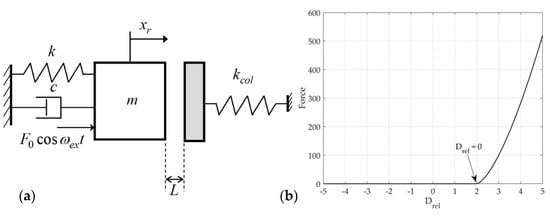 In this study, a theoretical model of S&R vibration, a representative nonlinear vibration that can occur in a mechanical system, is used. Figure 1 presents the rattle model considering the mass, linear spring, nonlinear elastic contact, and damping. is a linear spring coefficient. This system is excited with amplitude and excitation frequency . As shown in Figure 1a, the distance from the impact surface at the static equilibrium position of the system is . In addition, the nonlinear elastic model of the impact force was defined as Hertz’s contact model [17,18]. The coordinate describes the vibration motion of the rattle model at the static equilibrium position. Figure 1b shows the impact force of Hertz’s contact model for a relative displacement. All systems consider a mass attached to a spring with a stiffness coefficient and coefficient of viscous damping .