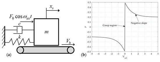 Squeak is a self-excited vibration caused by friction that frequently occurs in automobile brakes, artificial hip joints, and gear systems [8,10,11]. Many studies have examined the vibration instability caused by friction based on an analysis of brake squill noise. The method to solve these problems was studied mainly by analyzing the instability using vibration equations, including nonlinearity of friction and linear stability through the linearization of nonlinear terms. On the other hand, the linearized approach can only be investigated near equilibrium. Kang [8] described complex models, such as instability caused by friction curves, modal coupling instability, gyroscopic, and friction damping occurring in automobile disc brake systems. They also analyzed the influence of squeal. Nam et al. [10] investigated the vibration instability in the lead screw system experimentally and analyzed the instability mechanism using the finite element method (FEM). Ouenzerfi et al. [11] examined the frictional instability occurring in an artificial hip joint and investigated the instability through a detailed FEM. In addition, the friction force is expressed as a function of the velocity in the dynamic instability of the friction-induced model. Higher-order nonlinear problems, such as chaos, were described because the model includes extreme nonlinearity in the creep section [12,13,14,15,16]. Kang [15] used a two-degree-of-freedom friction model to show that the chaotic phenomenon is generated by self-excited vibrations and investigated the parameters that create chaos.