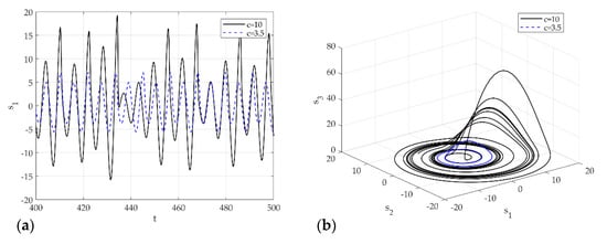 As mentioned earlier, Figure 12, Figure 13 and Figure 14 presents the representative attractors of each system divided into chaos and non-chaos, and show the rattle, single-mode squeak, and multi-mode squeak models, respectively. Figure 12a,b shows the time series plot and phase portrait of displacement for the rattle model in and . The dotted line oscillates constantly, and the solid line vibrates with an irregular amplitude. In phase space at , it produces one stable limit cycle without impact and oscillates stably. On the other hand, in , the system includes impact, and the trajectory appears without a specific period. In other words, it expresses chaos.