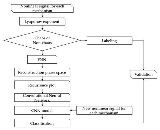 As shown in the flow diagram, the proposed method classifies the characteristics of the nonlinear vibration signals not included in learning after learning a dataset of nonlinear vibration signals composed of images using the CNN architecture. In other words, the focus of this study was to learn the vibrating signal visualized based on RP by machine learning and to distinguish between the causes of vibration, such as friction or impact and chaotic characteristics. Details of the proposed method are as follows. First, the nonlinear time series data of the parametric deterministic dynamic system was obtained by numerical analysis using the Runge–Kutta method. The Lyapunov exponent was calculated for the time series data and chaos was determined. The image visualization method of the vibration signal used the FNN algorithm to determine the embedding dimension and reconstruct the phase space. The reconstructed signal was expressed as an unthresholded RP to visualize the dynamic characteristics. Finally, the dataset composed of the visualized signals was trained by the CNN model and verified using the Lyapunov exponent.