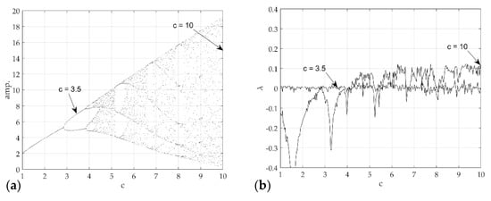 For preliminary analysis, the Rossler model, a representative chaotic system, was used [36]. The Rossler model has already been studied extensively. It is a simple chaotic vibration system because it can produce a section that always vibrates in response to a parameter change. is selected as the control parameter. The other parameters are and , and the initial condition is .