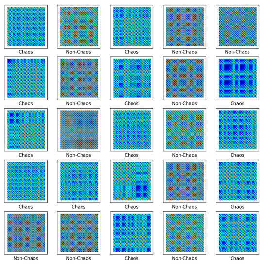 As shown in Figure 15, images by chaos and images by non-chaos are always vibrating, so repetition appears in a complex form. Six thousand data were used in the total dataset and consisted of 200 × 200-pixel images. To escape the local minima and converge to a lower loss, and prevent overfitting, the learning rate was adjusted for each specific step using a callback function. Each step consisted of five convolution layers with 32-2 × 2 filter, 64-2 × 2 filter, 128-2 × 2 filter, 256-2 × 2 filter, and 512-2 × 2 filter.