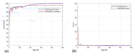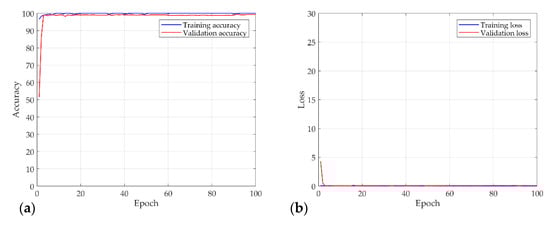Figure 9 shows the results of a numerical experiment for the proposed procedure. Chaos characteristics were found in the training dataset for 2240. At the same time, it was verified through 560 validation data in each epoch. After that, the tests were performed on 1200 testing datasets on the trained CNN model. The batch size was set to 10, and the learning rate of the optimization function was 0.0001. Figure 9a,b shows the accuracy and loss function of the training data and validation data for each epoch. As shown in the learning result, the accuracy showed a logarithmic function and converged to approximately 100, and the loss also showed a negative exponential function and converged close to zero. The accuracy and loss of validation data and the training data almost coincide, suggesting that the training proceeded well without overfitting. This suggests that the proposed procedure detects the chaos characteristics of the Rossler model well. In addition, 1200 testing datasets that were not used for training were also classified with 99% accuracy.