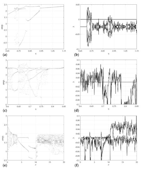 Figure 11 shows the results of chaotic analysis for the model control parameters corresponding to each model. Figure 11a is the calculation result of the largest Lyapunov exponent of the rattle model, and Figure 11b shows the corresponding bifurcation diagram. The other parameters and initial conditions are , , , and . Figure 11c,d shows the Lyapunov exponent calculation result for the control parameter of the single-mode squeak model and the corresponding bifurcation diagram. The other parameters and initial conditions are , , , , , , , and . Figure 11e,f presents the Lyapunov exponent calculation result and bifurcation diagram for the control parameter of the multi-modes squeak model. Other parameters and initial conditions were , , , , , , , , and . In this study, only each model and chaotic characteristics were distinguished, so other detailed types of attractors were not considered. The analysis results show that the S&R model changes with extreme nonlinearity in the largest Lyapunov exponent for the change in the control parameter.