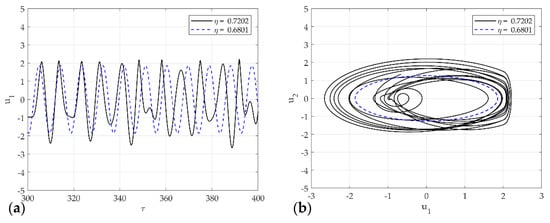 Figure 13a,b shows the time series plot and phase portrait of displacement for the single-mode squeak model in and . The dotted line oscillates constantly, and the solid line vibrates with an irregular amplitude. In the phase plot, the flat phase means the stick phase in the stick-slip. When produces an unstable limit cycle in phase space, it vibrates unstably for 1 period within the limit cycle. On the other hand, in , the system produces an unstable limit cycle and generates chaos without a constant cycle.