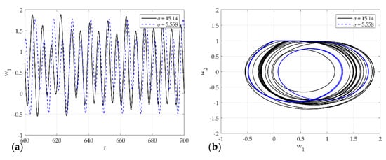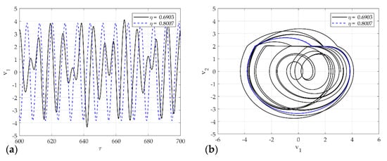 Figure 14a,b shows the time series plot and phase portrait of displacement for the multi-mode squeak model in and . The dotted line constantly oscillates with two amplitudes, and the solid line oscillates with an irregular amplitude. In phase space at , it vibrates unstably for two periods within the limit cycle. On the other hand, at , the system generates an unstable limit cycle and generates chaos.
