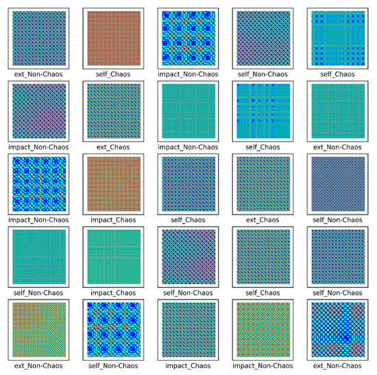 The S&R model was classified into six classes to distinguish between chaos and non-chaos, and an unthresholded RP was shown. Here, the six classes were divided into the rattle, single-mode squeak and multi-modes squeak, and chaos and non-chaos for each model. Table 3 lists the dataset sample, and Figure 15 presents a part of the training dataset.