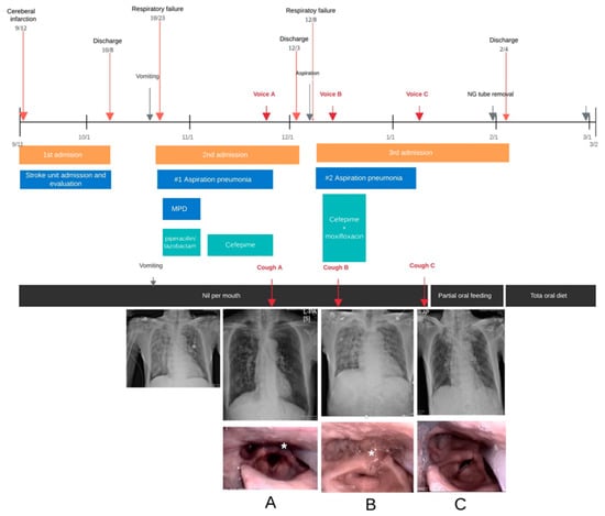 The timeline shows the clinical course of Case 1, with images taken during the FEES examination showing secretion aspiration (asterisk), but with improved swallowing after tube removal. The time points at which cough sounds were recorded are shown, (A) before aggravation, (B) at aggravation and poor coughing out state and (C), at recovery of cough. FEES = fiberoptic endoscopic evaluation of swallowing; MPD = methylprednisolone.