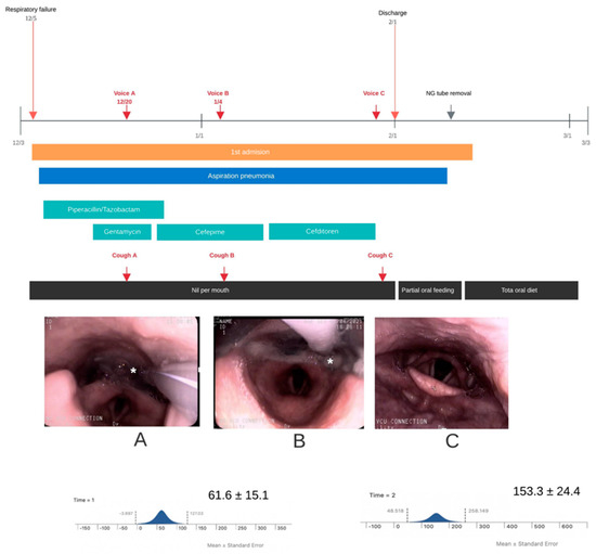 The timeline shows the clinical course of Case 2, with images taken during the FEES examination showing secretion aspiration (asterisk), but with improved swallowing after tube removal and improved peak cough flow. The times at which cough sounds were recorded are shown with cough (A) at baseline, (B) at follow-up but still with poor cough and cough (C) at improvement. FEES = fiberoptic endoscopic evaluation of swallowing; NG = nasogastric.