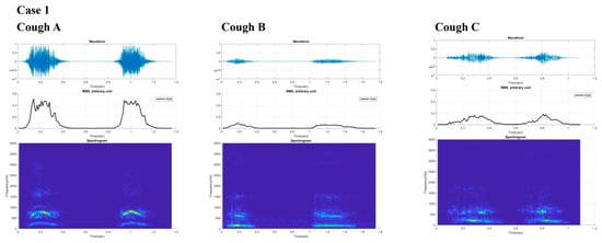 Digital cough sounds from Case 1 are presented for the three times, represented by several values (times) collected on different time points with cough (A) before aggravation, (B) at aggravation and poor coughing out state and cough (C), at recovery of cough. From top to bottom, waveform, root mean square, and spectrogram data of the cough sounds are shown. RMS = root mean square.