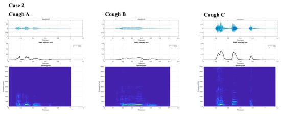 Digital cough sounds from Case 2 are presented for the three times, represented by several values (times) collected on different dates. From top to bottom, waveform, root mean square, and spectrogram data of the cough sounds are shown with cough (A) at baseline, (B) at follow-up but still with poor cough and cough (C) at improvement.