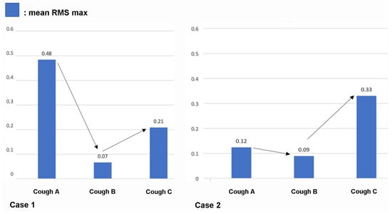 Coughing is the most common symptom of respiratory disease and an important defense mechanism to prevent inhalation or aspiration of foreign material. Moreover, it is critical for both diagnosis and monitoring of the treatment response. Cough frequency can be associated with infection load and is relevant to disease transmission or conversion rates [13]. Changes in cough characteristics can reflect evolving pathological situations and can be used to monitor respiratory status in various pulmonary disorders [13,14]. With the recent advancements in the automatic detection of cough, increased amplitude, frequency, duration, severity, and pattern of cough are relevant features for the automatic detection of respiratory diseases [15]. These techniques can be challenging for those with weak cough sounds and reduced cough frequency related to neurogenic causes. In this case report, we show how serial changes in cough sounds recorded with a digital device, and their RMS values, can be useful in reflecting changes in attenuated cough intensity and characteristics in patients with respiratory failure related to aspiration pneumonia.
