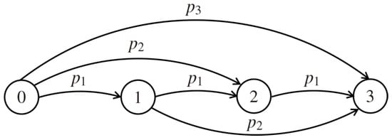In general, a digital network can be viewed as a collection of nodes located in some space, such that each node can be a transmitter or a receiver. The terminology and the probabilistic model of the end-to-end and hop-by-hop transport schemes for Bernoulli loss process in the channel used in this paper are explained in detail in [31,32]. The network consists of nodes, labeled , where N is a finite natural number. At a given instant of time, several nodes transmit simultaneously, each one towards its own receiver. Each transmitter–receiver pair requires its own link. The simplest model of N-hop opportunistic network is analyzed, such that the power signal decays with the distance, in a probabilistic way. To this end, for each transmitter node i (), it is assigned a vector of probabilities (not necessarily summing one), , , such that the jth element of is the probability of a signal transmitted by node i be received by node . Furthermore, it is considered a linear topology network [26,27,28], where nodes (units) are linearly spaced between the source and sink. It is also important to recall that the model does not evolve in time, i.e., all transmission attempts (successful or not) occur simultaneously. Figure 1 shows a simple opportunistic network sample.