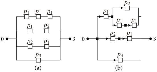 One of the issues that must be addressed by the network model is the successful transmission, i.e., when a signal initially transmitted by the source (node 0) reaches the sink (node N) at least once (regardless of the traveled route). The OR network model is related to some dependent discrete percolation model [33]. The diagram depicted in Figure 1 can be seen as a directed multigraph (DMG), named directed because each edge has a direction (from source to sink) and multigraph because multiple edges can have the same end nodes. A DMG is denoted by , where V is a set of nodes and is a multiset of ordered pairs of nodes, called edges. Each directed edge , is declared open when it has probability and closed otherwise. As noted, the probabilities depend on the distance between the transmitter node i and receiver node j. As a consequence, the possible set of probabilities is . Many applications of DMG are usually studied in basic probability courses, such as water supply networks, electrical circuits, among others. For instance, suppose that the objective is to supply water from node 0 to N. Consider open edges those open to the passage of water. Then, one is naturally interested in answering if the water supplied from node 0, which flows along the open edges only, can reach node N. An affirmative answer can be viewed, in fact, as a successful transmission for an opportunistic model.