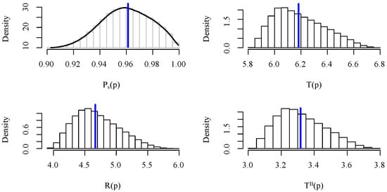 Estimated density and histograms for , , and when considering random probabilities. True mean values are represented by a blue vertical line.