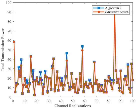 Total transmission power obtained from Algorithm 2 and the exhaustive search.
