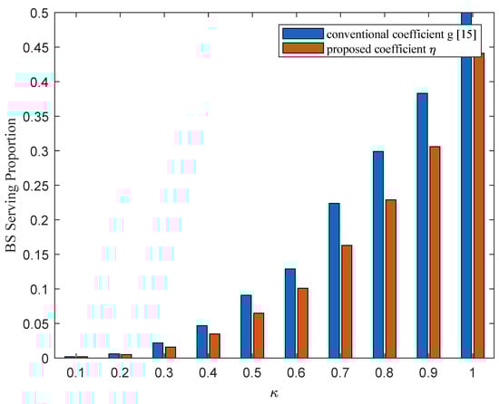 BS serving proportion by using different channel coefficient with SNR = 2 dB.