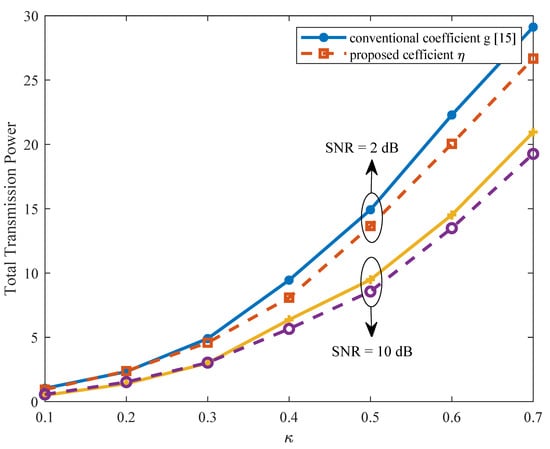 Then, we verify the rationality and effectiveness to introduce the newly relative coefficient (denoted by “”) to specify the selecting order at each iteration in Algorithm 2, instead of using the channel coefficient (“denoted by g”), which is usually chosen for the D2D case, as in the work [15]. Figure 4 illustrates the proportion out of all desired contents that need to be downloaded from the serving BS due to SINR constraints (denote by “BS Serving Proportion”). From Figure 4, we find out that using the relative coefficient could guarantee that more content files are downloaded from neighbor CHs rather than from the BS, especially with larger , which means that the available bandwidth W is limited. Since the BS transmission power is usually much higher, the reduced BS serving proportion would imply a reduced total power consumption for content reconstruction, as can be verified in Figure 5. This makes sense, since the interference effects from CHs to CUs are considered when we select CHs following the order indicated by , while the original coefficient g omits the co-channel interference from CHs to CUs, and thus may violate the SINR constraints.
