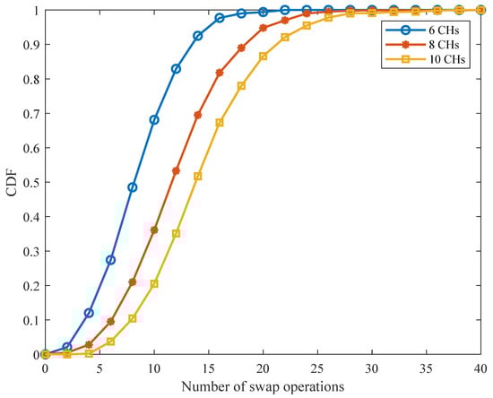 Next, given the fixed power allocation among all CHs, we evaluate the convergence and optimality of Algorithm 3 for subchannel allocation, in which we assume that no more than CHs are allowed to share the same SC. Figure 6 shows the cumulative distribution function (CDF) of the requested number of swap operations for Algorithm 3 to converge. We observe that Algorithm 3 can always converge within a small number of iterations and the convergence speed will become faster with a decreased number of CHs. Figure 7 plots the total transmission power obtained from Algorithm 3 for 100 channel realizations. The performances of the exhaustive search and the random pairing between CHs and SCs (denoted by “random matching”) are also plotted. It can be seen that the proposed Algorithm 3 brings a greater performance gain over the random matching. Meanwhile, Algorithm 3 is shown to be capable of approximately reaching the optimal results obtained by an exhaustive search in most cases, which, nevertheless, requires lower computational complexity.