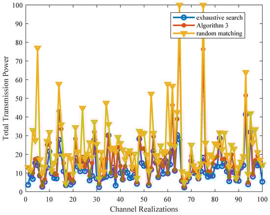 Total transmission power obtained from Algorithm 3 versus the random matching and exhaustive search.
