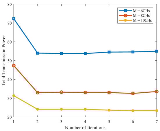 Before demonstrating the superiority of the partial downloading scheme and the NOMA-enhanced transmission scheme for our considered distributed storage systems, we first verify the convergence of the joint power and subchannel allocation optimization, i.e., Algorithm 4, which alternatively implements Algorithms 2 and 3 under the maximum number of iterations . Figure 8 describes the convergence behavior of Algorithm 4 as the iterative procedure executes, from which we can see that Algorithm 4 will converge after a limited number of iterations.