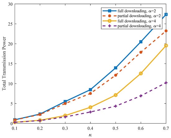 Then, we exploit the potential benefits of the partial downloading scheme over the conventional full downloading scheme [16]. Figure 9 compares the total transmission power for content reconstruction by using the partial downloading scheme with the full downloading scheme, where the full downloading scheme is achieved by exhaustively searching the optimal CHs and downloading all their stored symbols. As can be observed in Figure 9, the proposed partial downloading scheme can significantly reduce the total transmission power, especially with an increased number of stored symbols and restricted channel condition , in which case the partial downloading scheme provides more freedom of downloading choices and consequently alleviates the exponential increment of transmission power with the number of downloaded symbols.