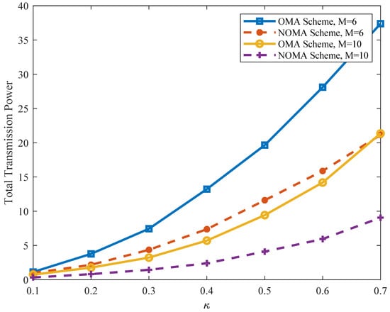 Total transmission power under the NOMA-enhanced scheme versus the OMA scheme.