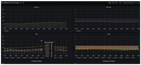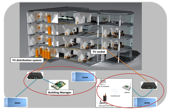 - Comfort (temperature, relative humidity and CO2) and electricity consumption parameters. 250 dwellings from 25 buildings in the lighthouse district of Coronación are monitored by means of sensors. In each dwelling we have installed the following sensors: 1 energy sensor, 1 temperature sensor and 1 humidity sensor. In 35 dwellings a CO2 sensor has been added. This sensor includes additionally a temperature sensor and a humidity sensor. Measures for each sensor are collected every 5 s. Hourly aggregates of all sensor measurements are made and the ASHRAE comfort values are calculated for each dwelling. See Section 4.5.3 for comfort calculation details. Sensors are deployed, taking advantage of the building’s infrastructure. This original architecture for data gathering is based on the TV distributed coaxial system. To achieve that, adapters are placed at the TV distribution system header and each of the dwellings. Figure 4 shows the infrastructure. Thus, the TV distributed system is used to direct that information to the CIOP platform without requiring an Internet connection from each of the dwellings residents. Internet connectivity is provided at building level to route data from each of the dwellings towards the CIOP platform. The network created by this infrastructure is bidirectional and enables the provision of other services to/from the dwellings.