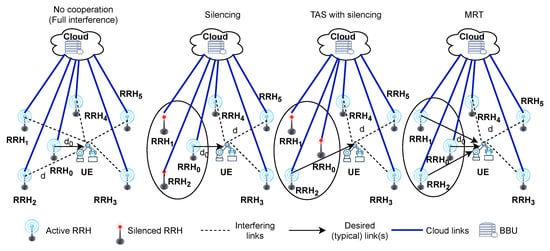 - cooperating with the typical link through the CRAN to serve the UE (BBU at CRAN enables coordinated multi-point transmission and cooperative solutions, similar to scenarios described in [,,,]). Under the cooperation, we proposed silencing, TAS with silencing and the MRT scheme as shown in Figure 1 which is explained in detail in the following Section 2.2.
