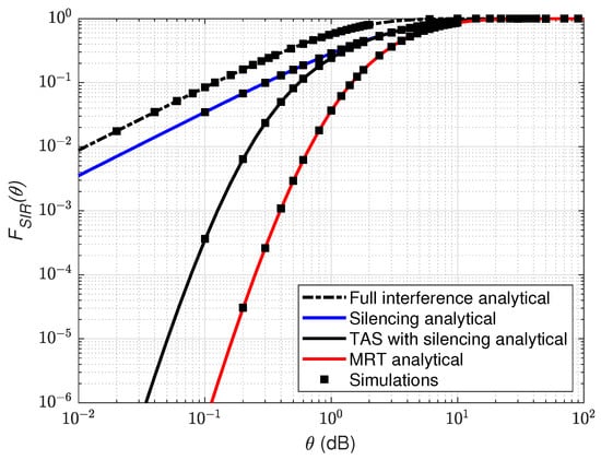 Figure 2 illustrates the CDF of distribution as a function of threshold (dB) for the considered transmission schemes with cooperating RRHs. As shown, for the left tail distribution of the MRT scheme is already exceeding the outage probability value of as compared to the silencing scheme and TAS with silencing schemes. While with the , RRHs silenced the left tail of the silencing scheme exceeds in comparison with full interference. Similarly, the results seem to be better with the TAS with silencing scheme, where the left tail goes beyond for a higher threshold of compared to the silencing and the full interference scenario. The MRT and TAS with silencing curves seemed to attain higher values of than the silencing and the full interference schemes, which shows significant performance gain and a higher diversity gain at the UE. However, MRT curves bend to a higher threshold in comparison with the TAS scheme because joint transmission with cooperating RRHs in MRT enhances the gain at the UE. Finally, we validate the analytical results via Monte Carlo simulations.