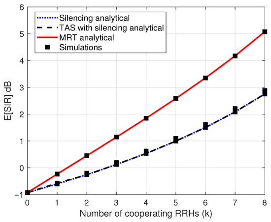 Figure 3 illustrates the expected value of as function of number of cooperating RRHs k for considered transmission schemes. For all schemes, the expected SIR increases as k increases. While, with the same value of k, the expected value of of MRT schemes is higher than the silencing and TAS with silencing schemes. The reason is that RRHs are jointly transmitting to the intended UE to enhance diversity gain, which increases , which in turn improves the system performance. MRT helps to cope with link failure and blockages enabling multi-connectivity to serve intended UE through several cooperating links. This increment of with an increase in k improves outage performance at the tail of CDF as shown in Figure 2. Meanwhile, TAS with silencing and silencing shows very similar performance because both schemes have a single RRH transmitting to the UE, which has little diversity gain compared to MRT.