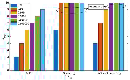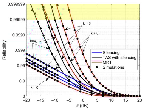 Overview of reliability analysis as a function of for silencing, TAS with silencing and MRT schemes with different level of k.