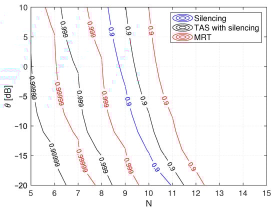 Figure 5 shows the performance analysis of silencing, TAS with silencing, and MRT schemes as a function of N and , with the fixed number of cooperating RRH . As shown, the performance of MRT improves with an increase in N as compared to silencing and TAS with silencing because jointly transmitting from cooperating RRH or the involvement of more RRHs, provides more diversity and array gain, thus resulting in lower outage probability improving reliability. TAS with silencing outperforms silencing, but a reliability level of five nines is attainable only at a lower value than MRT and for smaller N. However, the silencing scheme attains a reliability level of one nine because of the selection of the best RRH link, which provides some additional diversity gain compared to silencing, and thus improves performance.