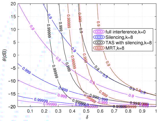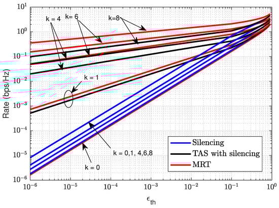 Figure 7 illustrates the target transmission rate as a function of the target reliability constraints for silencing, TAS with silencing, and MRT schemes for different levels of cooperating RRHs k. The target rate to attain target reliability for the silencing scheme is calculated from (11), while TAS with silencing and MRT schemes through numerical analysis from (12) and (13), respectively. We find that, as the number of cooperating RRHs (k) increases, there is a significant improvement over the rate in all schemes for given target reliability. However, MRT offers a higher rate for the given target reliability constraints. In comparison, TAS with silencing schemes also offer a higher rate compared to silencing schemes for the same target reliability. We see that limiting the interference with RRHs cooperation using silencing, TAS with silencing, or MRT schemes, shows a significant performance gain for target reliability constraints. As mentioned, for , all the schemes operate with the same target rate. The slope of MRT curves increases with increasing cooperating RRHs k compared to TAS and silencing schemes because the MRT offers higher diversity gain. Even with fewer RRHs, higher data rates are achieved.
