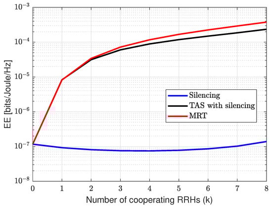 Figure 8 presents the CRAN EE as a function of the number of cooperating RRHs for each scheme. The parameters in the power consumption model in (17) are taken from [] where , maximum transmit power for RRH Watts, active mode power for RRH Watts, sleep mode power for RRH Watts. The finding shows the improvement over the EE with the increase in cooperation for each scheme. However, from (17), power consumption increases with an increase in cooperation. As shown, the MRT scheme has EE relatively higher than TAS and silencing schemes. This is because the number of cooperating RRHs jointly transmitting to the UE increases the data rate, consequently enhancing the energy efficiency. Meanwhile, in the silencing scheme, we transmit through a single RRH, where increments over the rate is a relatively small and relatively small improvement in EE as compared with MRT and TAS with silencing. However, in the case of TAS with silencing, an increase in cooperation and selection among the best links in transmission gives a significant improvement over the rate while power consumption is the same as that of silencing schemes. Meanwhile, further increase in MRT has an improvement over EE than TAS because the data rate is higher than TAS. Note that the data rate for MRT should grow as , however, in this case, it grows exponentially with k, which is counter-intuitive. The underlying reason is that once cooperating RRHs are increased for multi-point transmission, the data rate can be realized for intended UE while guaranteeing target reliability. This is evident for small networks, thus small k, while for large k, the rate would converge to conventional cases due to the law of the large numbers. This analysis shows MRT scheme has an improvement in energy efficiency as compared with TAS and silencing schemes.