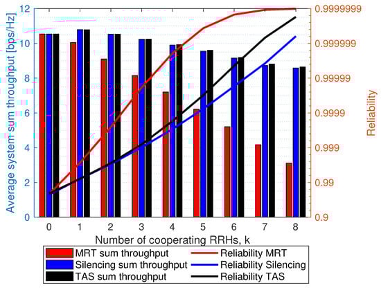 Overview of reliability levels achievable with different number of cooperating RRHs k for silencing, TAS with silencing and MRT schemes with the .